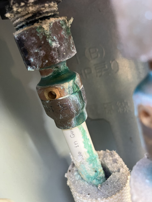 タンクと室外機に繋がっている高温のお湯が通る配管から水漏れを発見しました。